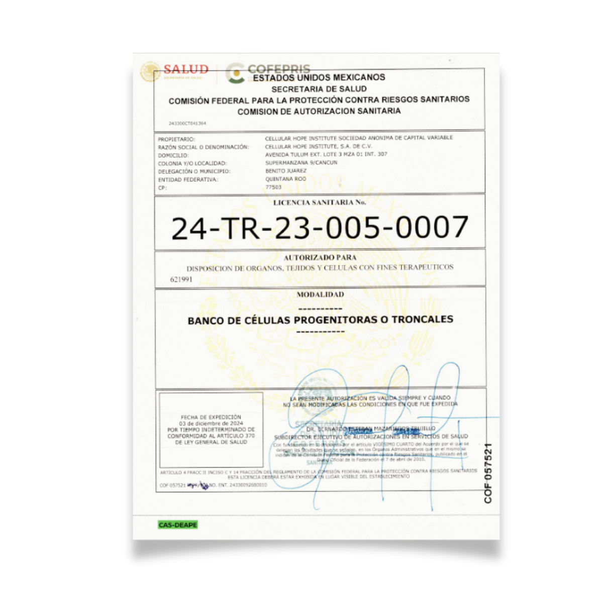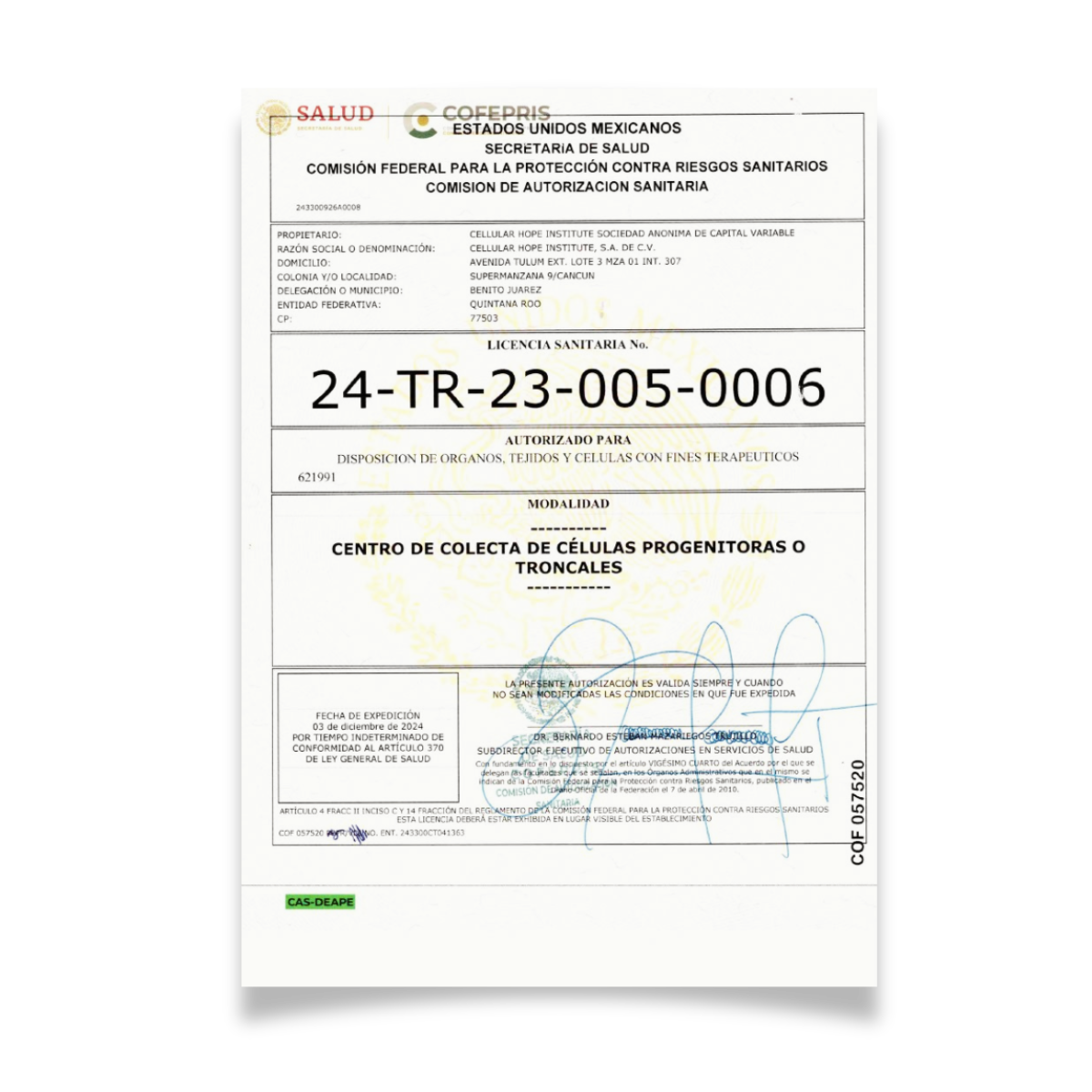 The Cellular Hope Institute’s offices are located in the 3rd floor of Tulum Trade Center in Cancun, our medical office is accredited both by the Mexican General Health Council and COFEPRIS (Mexican FDA). There, we have a highly-qualified team in many specialties, including pediatricians, radiologists, neurologists, anesthesiologists and regenerative medicine specialists, who convene with each other to produce the most reliable, efficable patient experience available.